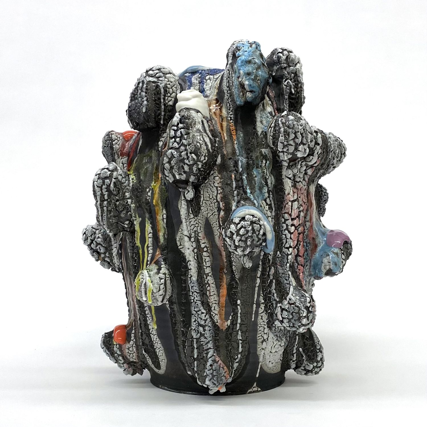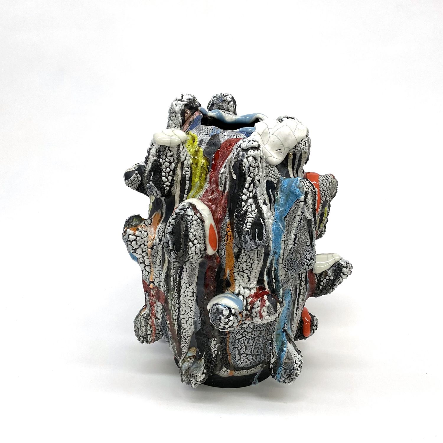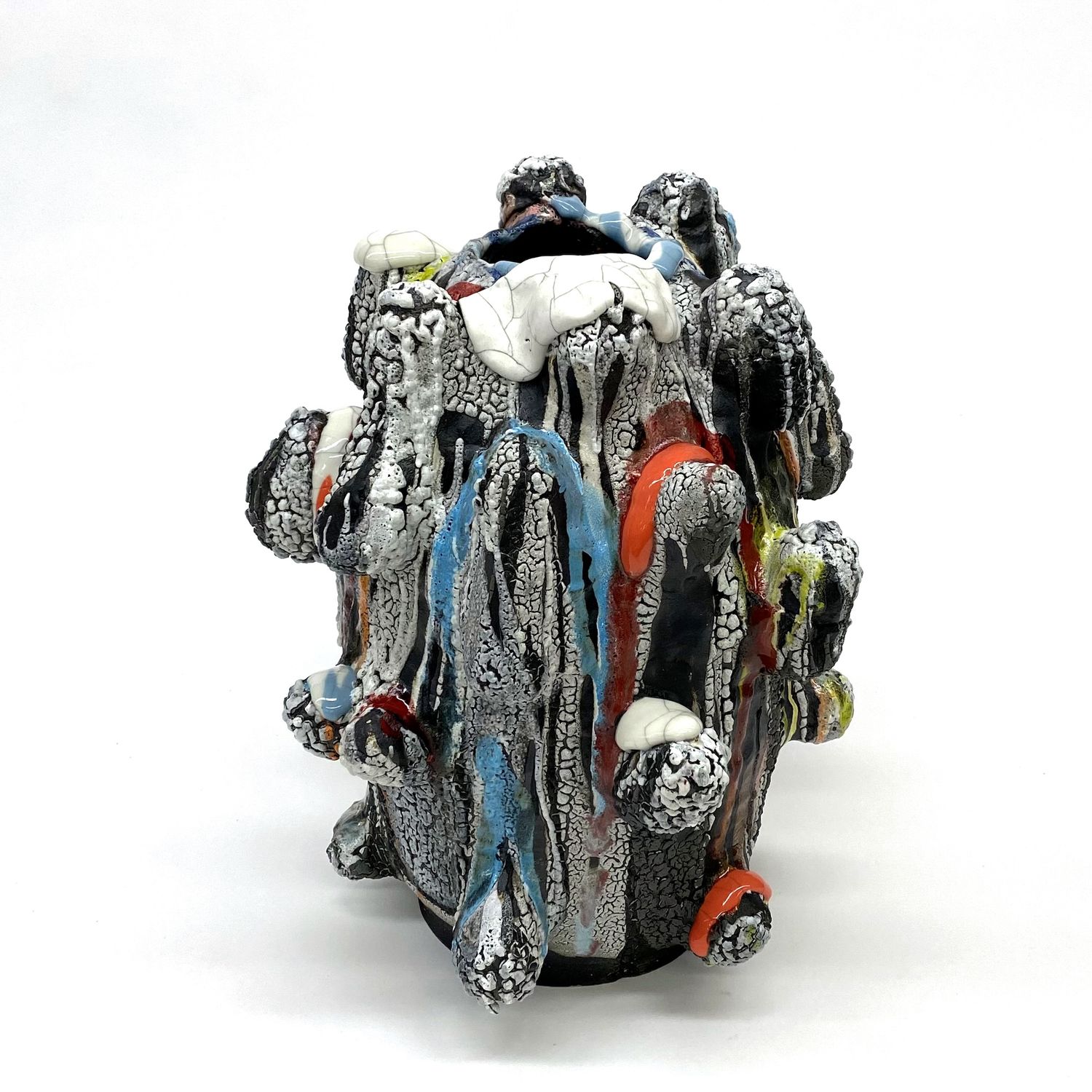 “As I worked on this series, humor and awkwardness emerged in the completed forms. My process is like that of a comedian or performer preparing for a routine: there are set ideas, techniques and expectations. However, each time you create or perform, something new emerges in response to external stimulus, or circumstance. I love improvisational work! Of course, there are things that I’m able to do with forethought and skill, but I’m most interested in those things that emerge in the moment. Unexpected, surprising, mostly uncontrolled. I am employing the wheel and hand building methods that leave many marks on the surface of the work.