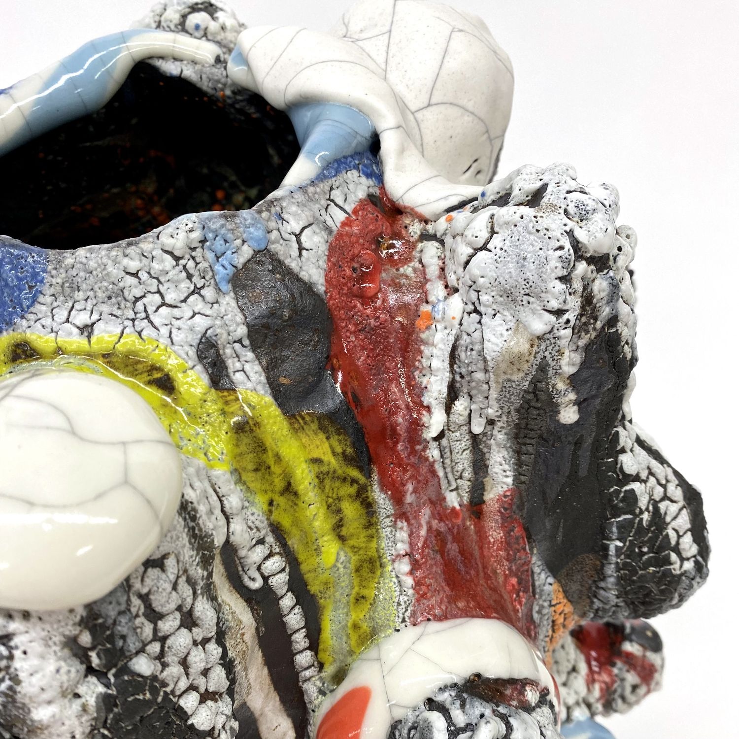 Vince Palacios has been working in the field of ceramic art since 1988. Palacios received his Masters of Ceramic Art from Alfred University and his BFA in ceramics at California State University at Long Beach. He now serves as Professor of the Ceramics Department at El Camino College in Torrance California. He came to El Camino College in 2011 after teaching for six years at Western Illinois University and ten years before that at California State University, Long Beach. He has shown his work nationally and internationally and is included in several important private collections as well as prominent museum collections. Palacios continues to exhibit his work and has developed a unique approach to the use of raw glass and ceramic materials as a means of crafting intricate narratives addressing geological process, pyroclastic interaction, and heat/chemical reactions