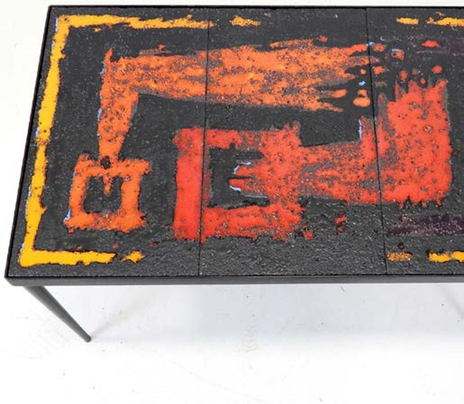 Rectangular top composed of three glazed lava stone tiles decorated with an abstract motif in vibrant orange, red, and blue on a black ground. Blackened iron base with tapered legs.