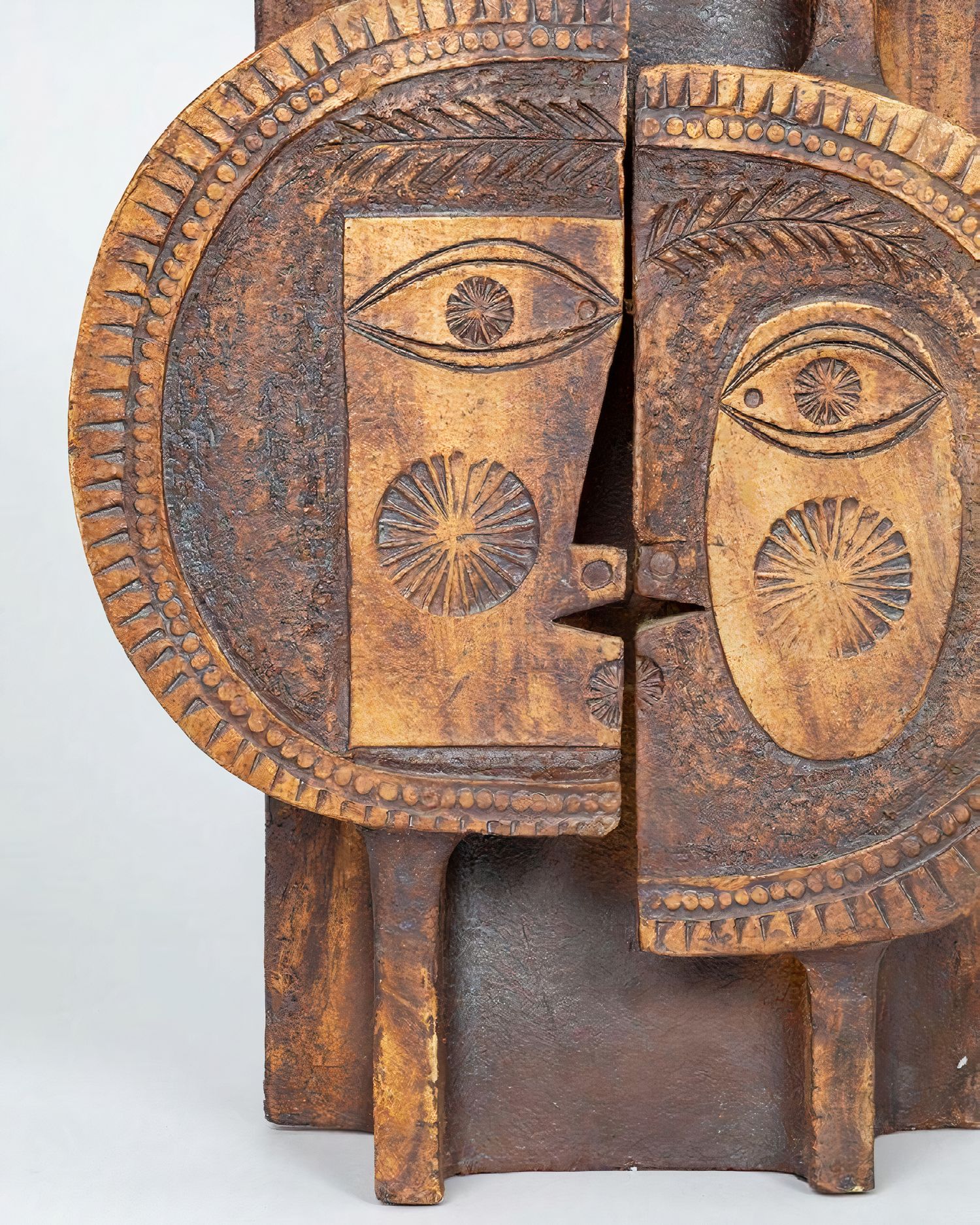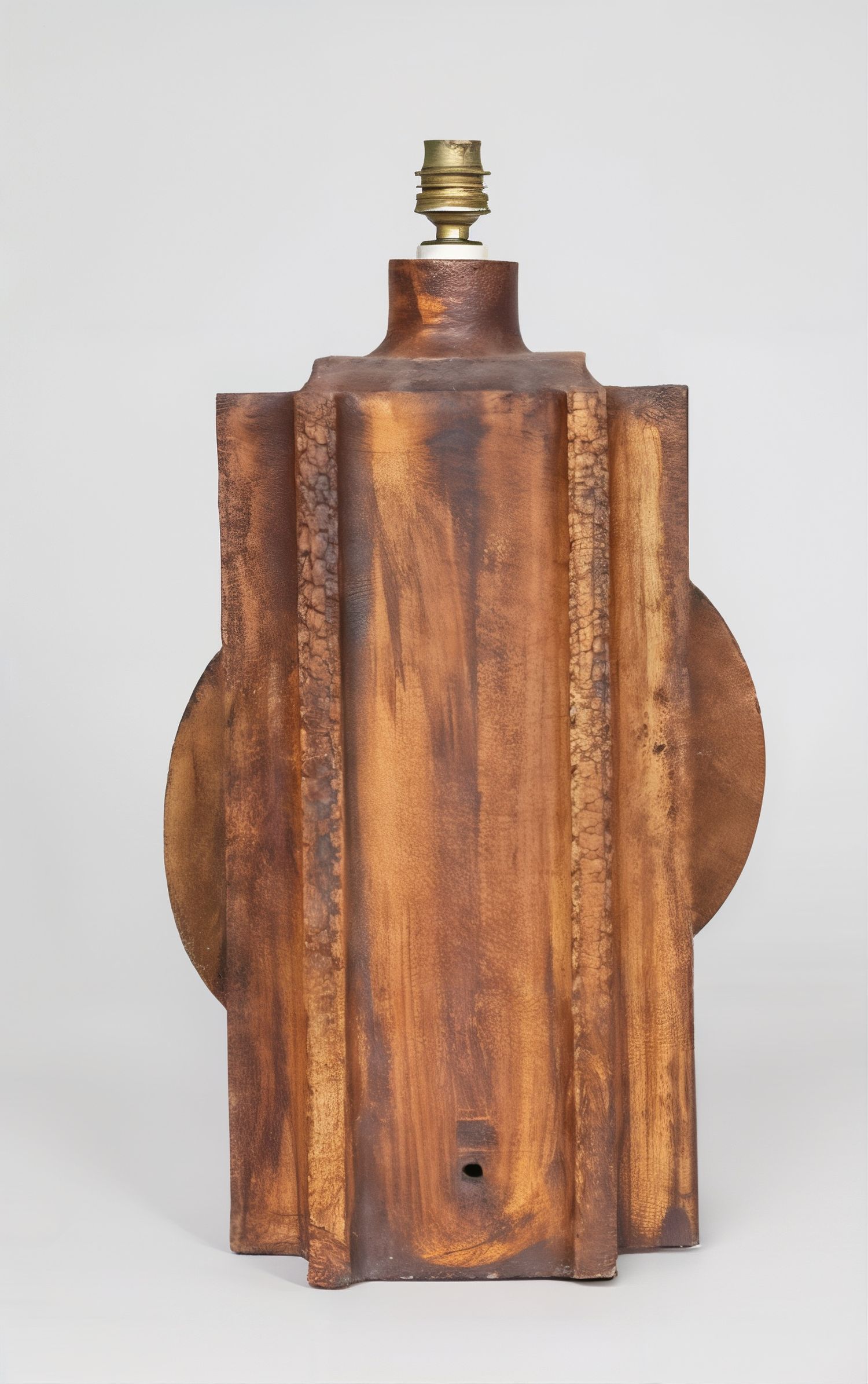 This lamp base is the result of the collaboration between two major artists of the revival of ceramics in Vallauris: Jean Derval and Roger Capron. They are nicknamed, along with Robert Picault, the “Three Roosters” and have each developed their own style that left a lasting mark on the arts of fire in France. This piece, with a surrealist theme, echoes the motif of the sun.