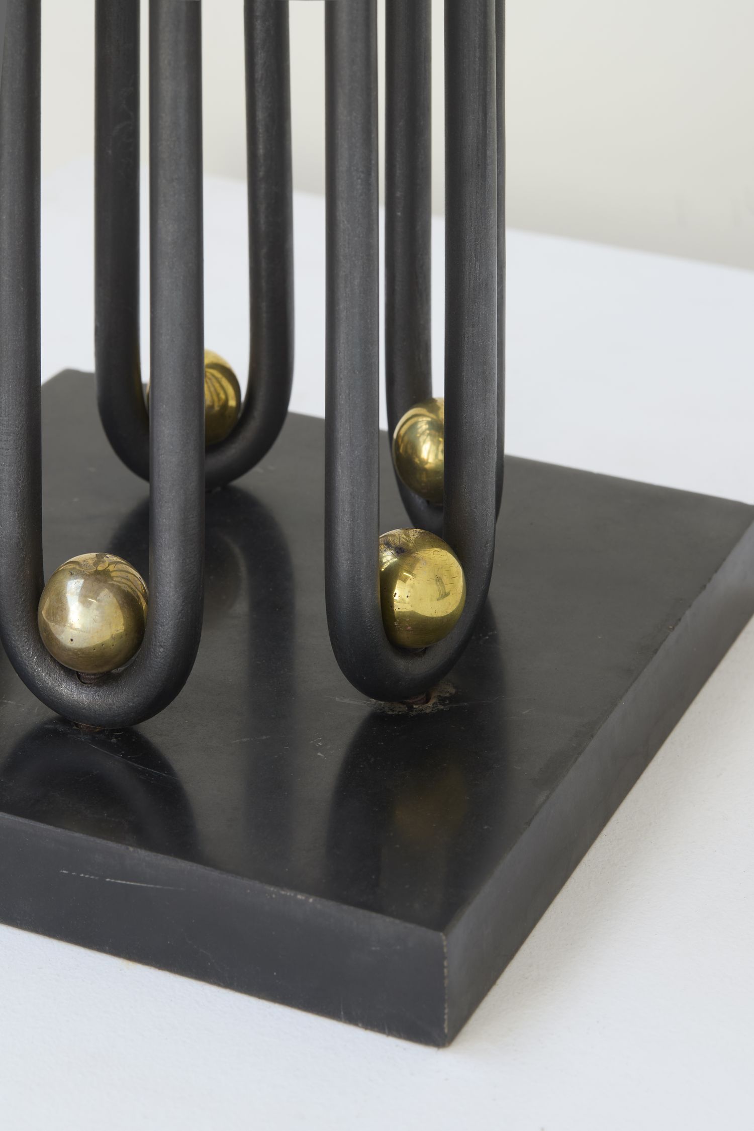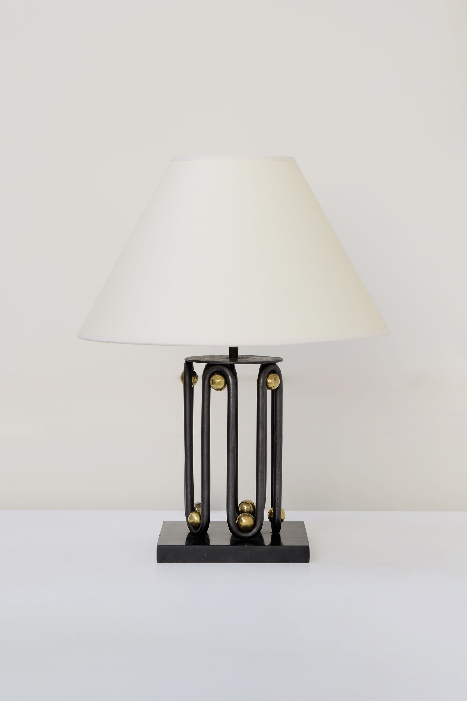 The stem of this lamp is composed of a single undulating tube in black-patinated wrought iron, interspersed with polished bronze spheres alternating between the upper and lower sections. A circular metal plate, painted in its original black finish, tops the stem and supports a central rod holding the lampshade (not original). The whole rests on a square base of black marble.