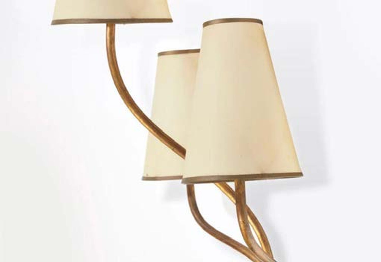 This pair of sconces in gilded metal is composed of three curved arms. Each branch with a non-original conical lampshade. Good original condition; the patina has been touched up to restore its brightness. New electrical system.
