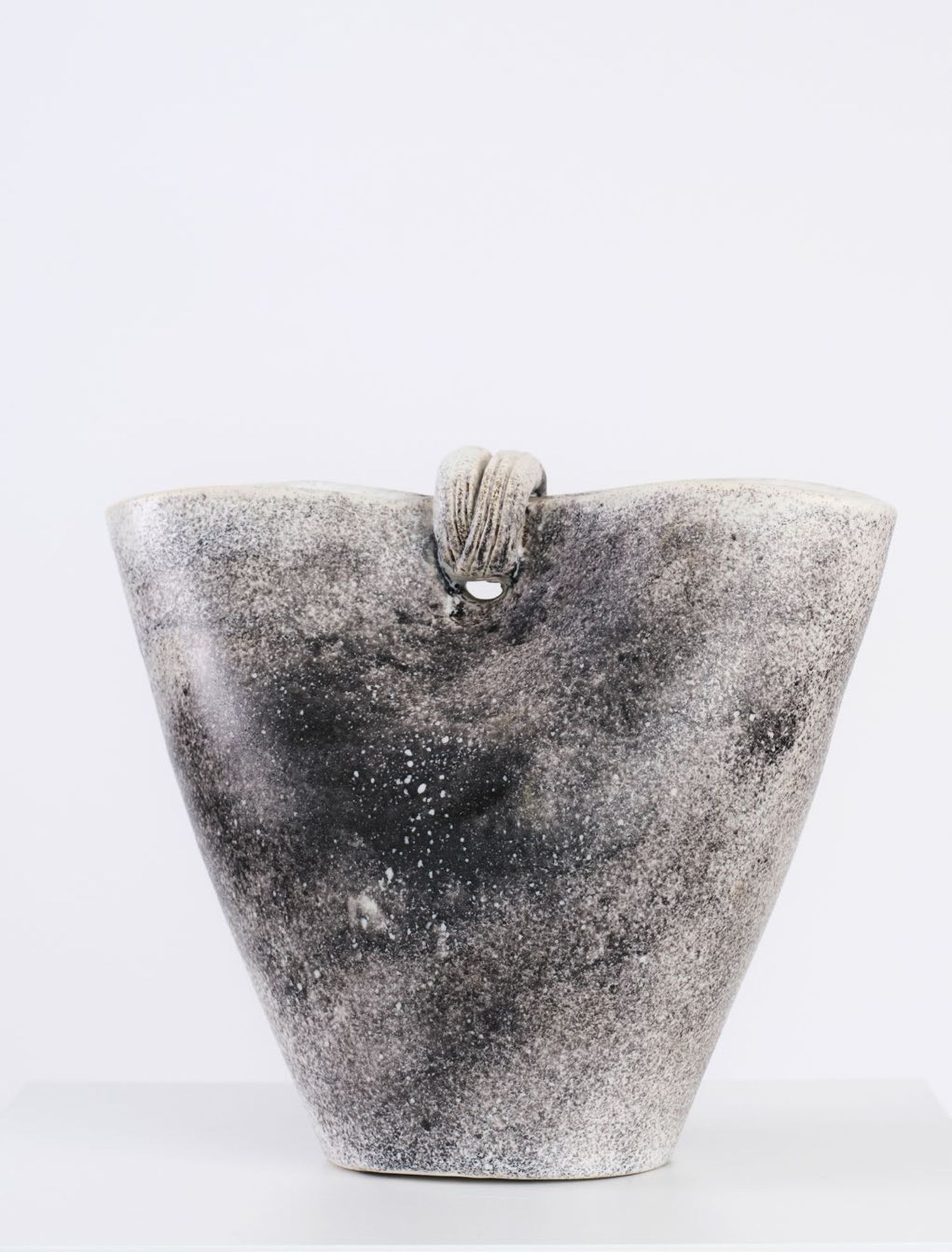 Signed vase, glazed earthenware in shades of white, speckled with gray.