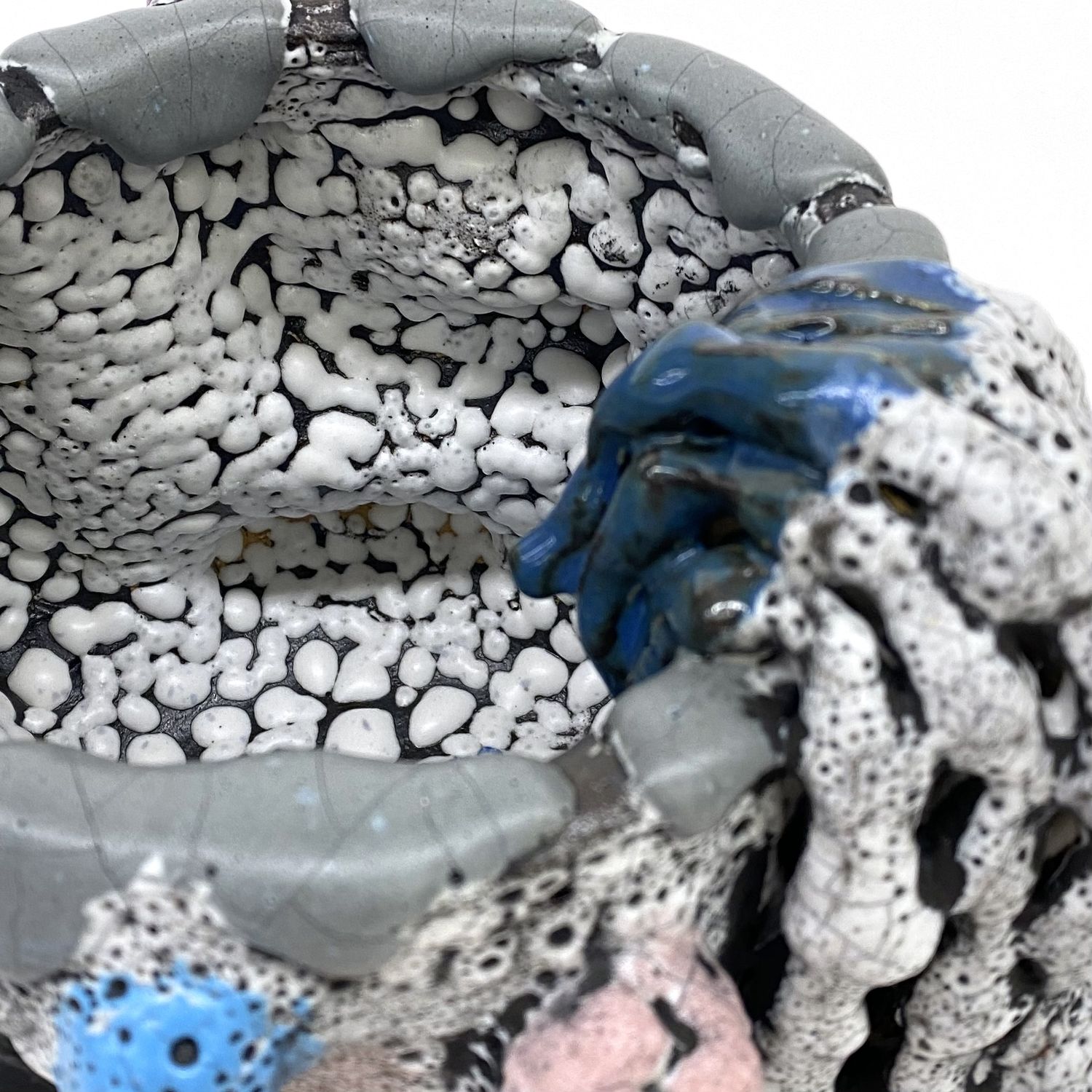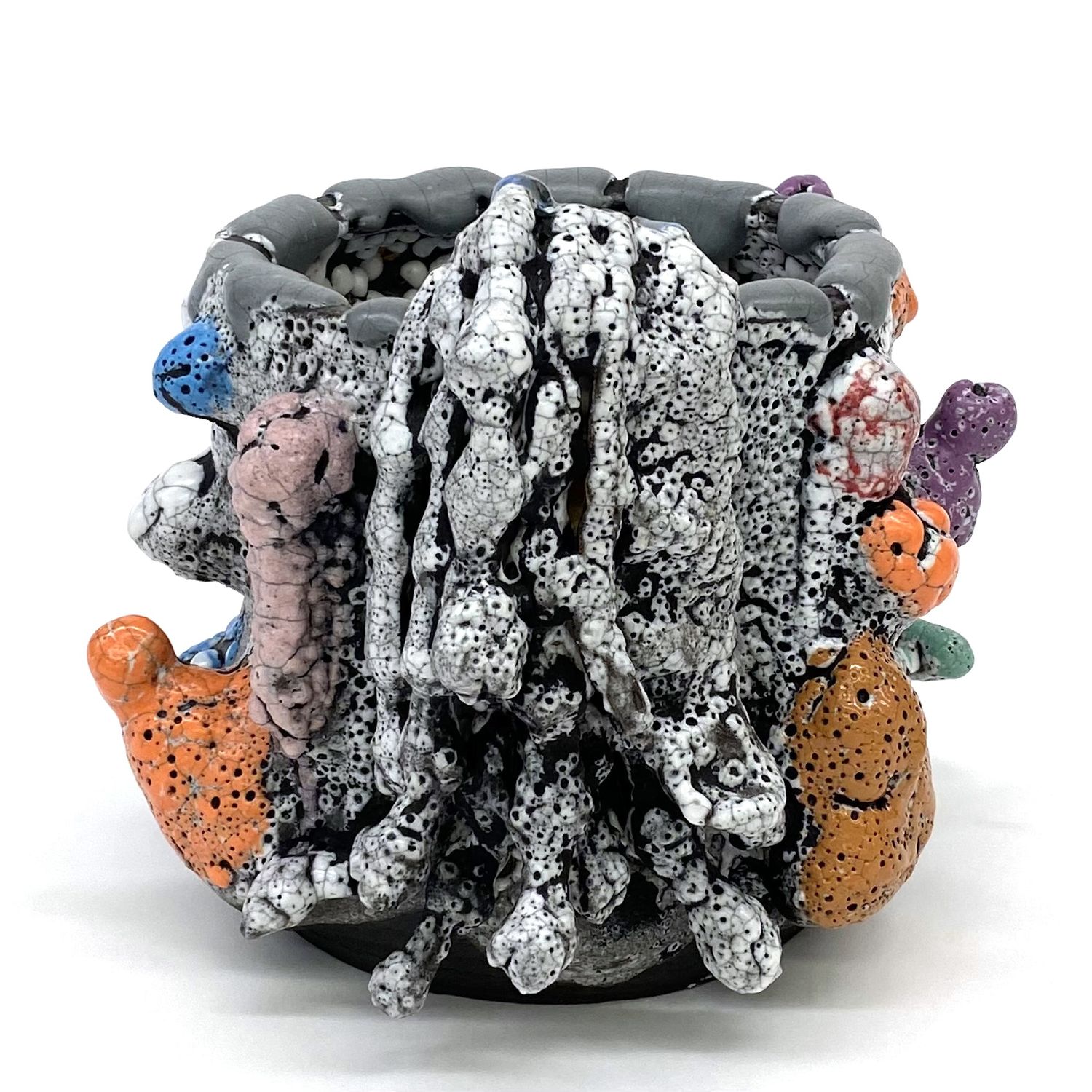 “As I worked on this series, humor and awkwardness emerged in the completed forms. My process is like that of a comedian or performer preparing for a routine: there are set ideas, techniques and expectations. However, each time you create or perform, something new emerges in response to external stimulus, or circumstance. I love improvisational work! Of course, there are things that I’m able to do with forethought and skill, but I’m most interested in those things that emerge in the moment. Unexpected, surprising, mostly uncontrolled. I am employing the wheel and hand building methods that leave many marks on the surface of the work.