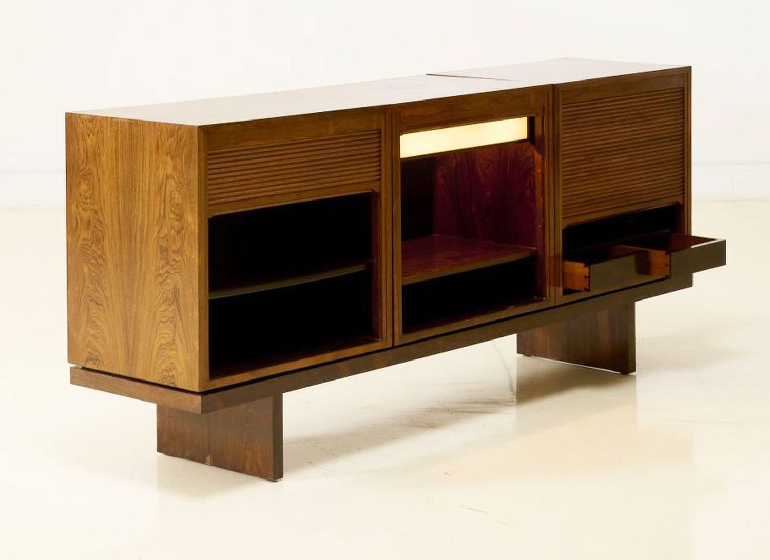 Rare modular sideboard in solid rosewood and plywood with rosewood lamination. Contains three vertically opening matte doors. Interior with light fixture, shelves, and drawers.