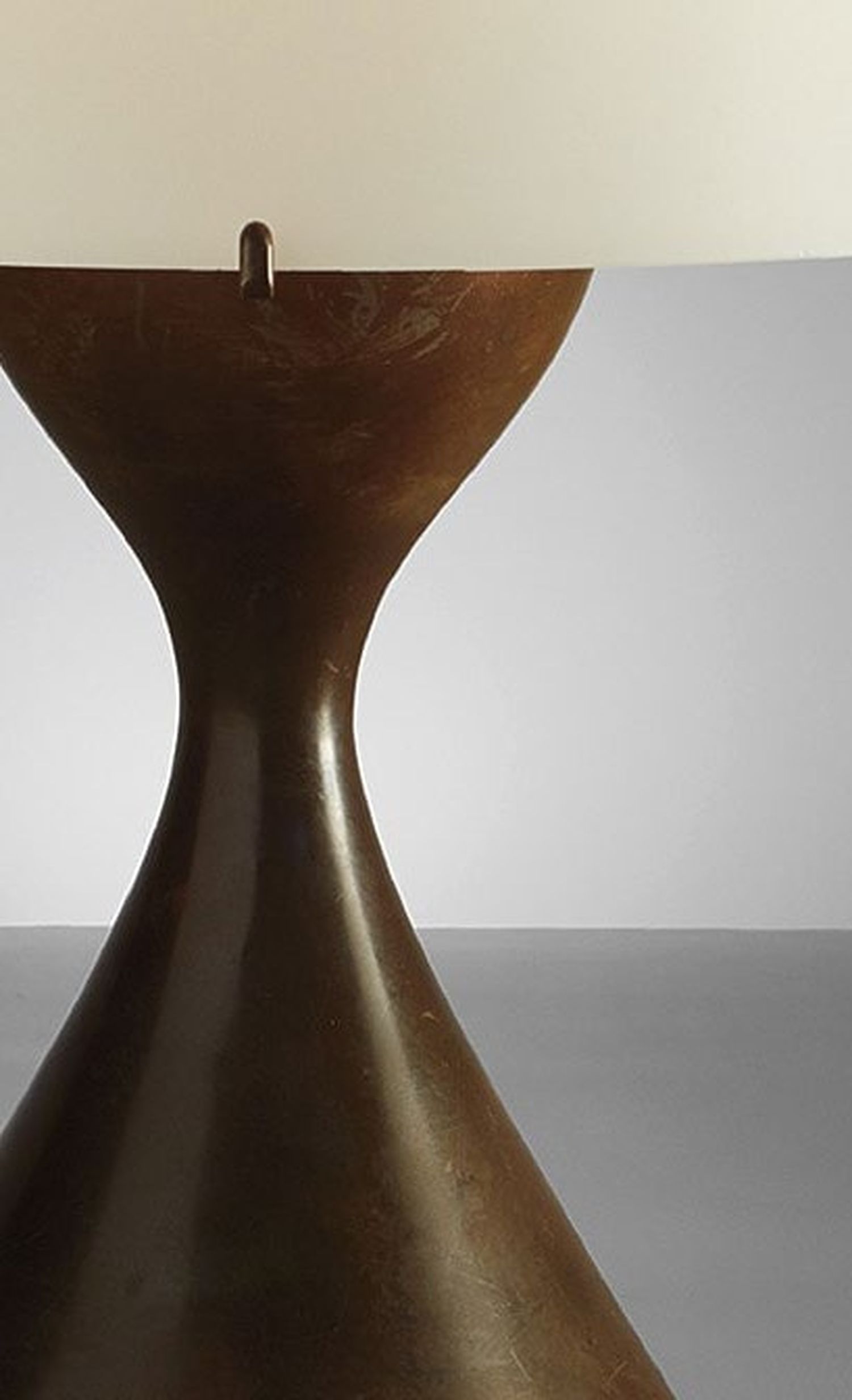 The Table lamp created in 1956 features a striking hourglass-shaped base crafted from patinated brass, topped with a conical opaline glass shade. The soft, matte white finish of the glass contrasts beautifully with the substantial solid brass base and a sculpted brass tray, creating an extravagant and harmonious composition.