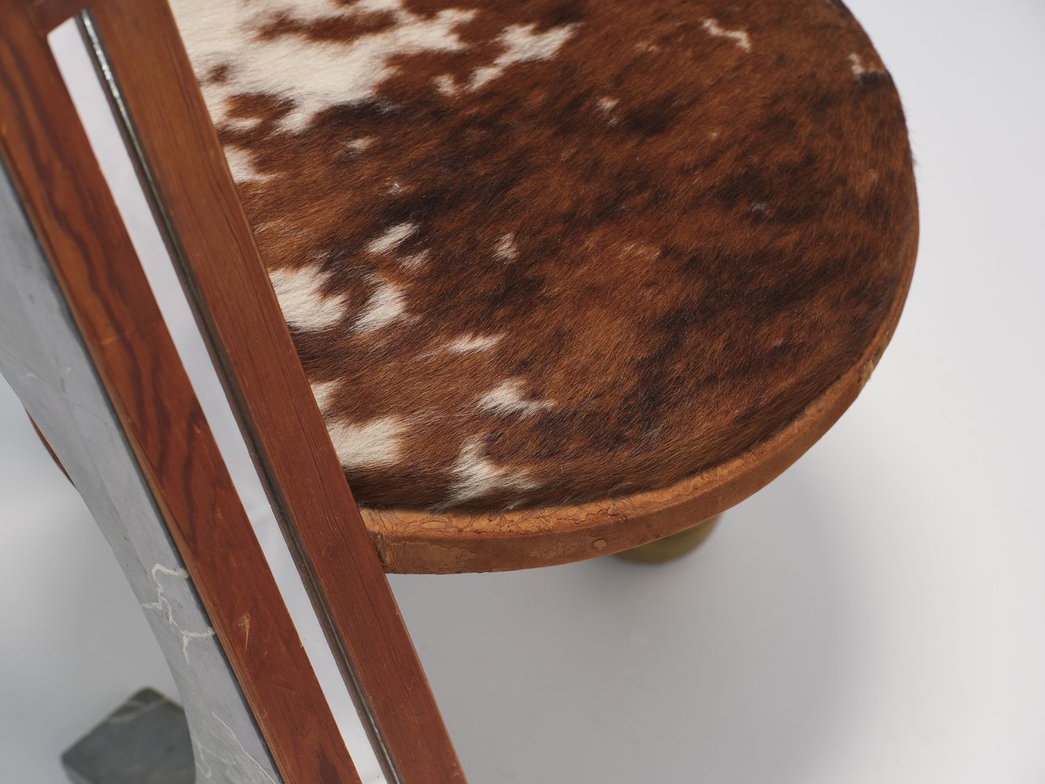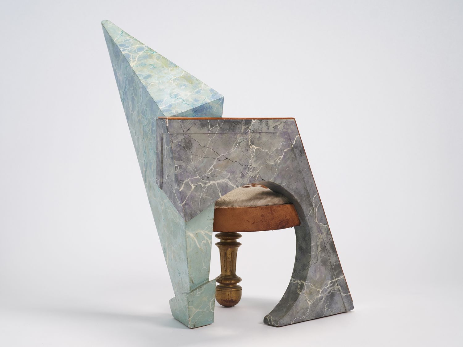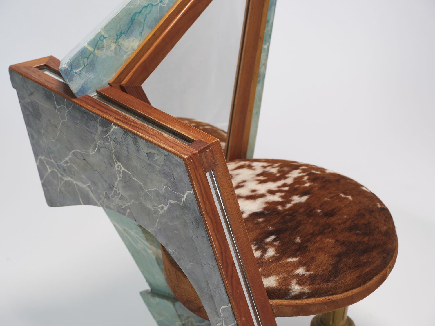 Wood with trompe l’œil faux marble finish, mirror, and cowhide seat. Néotù edition. One-off piece. Pucci de Rossi signature engraved in wood with the mention “Artist’s proof” No. 1 — PDR Le Veneziana AK Paris 1985.