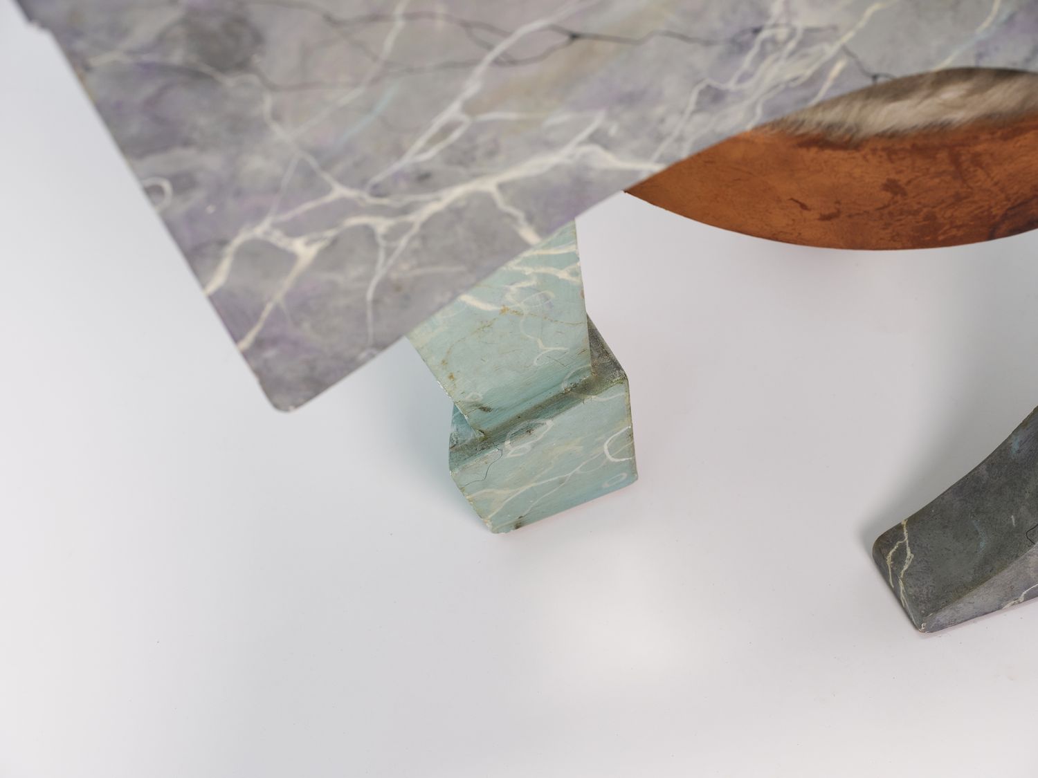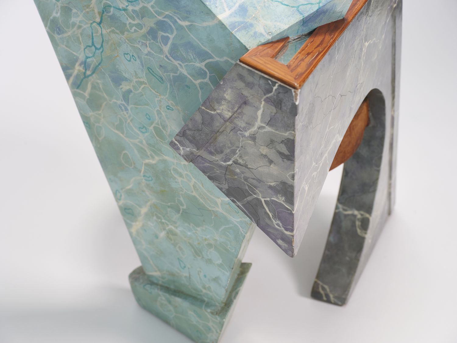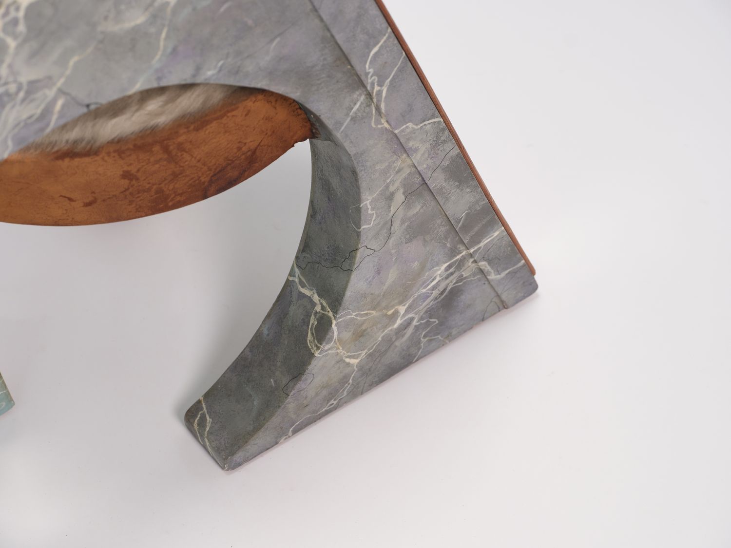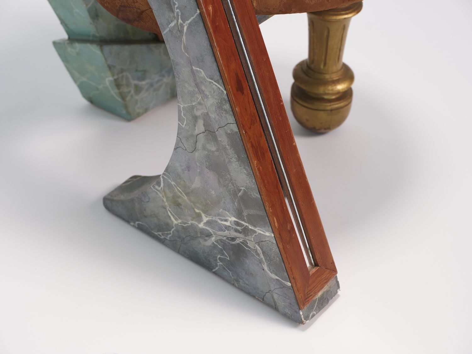 Wood with trompe l’œil faux marble finish, mirror, and cowhide seat. Néotù edition. One-off piece. Pucci de Rossi signature engraved in wood with the mention “Artist’s proof” No. 1 — PDR Le Veneziana AK Paris 1985.